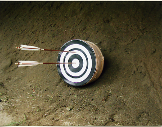 | 遠的の射位は近的と同じ位置から、体を左斜めに向いて60mの 的(100cm)を「3人立」で行射します |